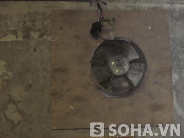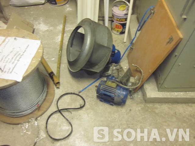 Quạt gió của hệ thống điều khiển thang máy được lắp tạm bợ trên một miếng gỗ, dây điện nối chằng chịt.