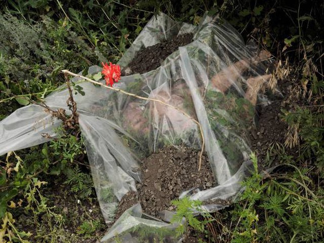 Thi thể của 1 đứa trẻ được che bởi lớp nilon trong.