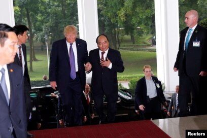 Thủ tướng Nguyễn Xuân Phúc nắm tay dẫn Tổng thống Trump đi vào Văn phòng Chính phủ khi ông đến dự cuộc hội đàm song phương tại Hà Nội.