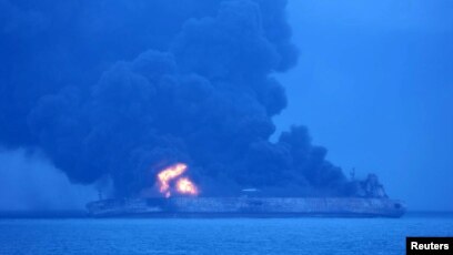 Một tàu chở dầu của Iran bốc cháy dữ dội ở Biển Hoa Đông hôm 7/1 sau khi đâm một tàu Trung Quốc làm 32 thuyền viên mất tích.