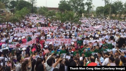 Người biểu tình giơ cao biểu ngữ tại Giáo hạt Văn Hạnh ở Hà Tĩnh.