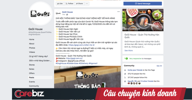Đối với các thương hiệu thuộc Golden Gate, bắt đầu ghi nhận việc đóng cửa ở một số điểm kinh doanh. Trên Fanpage của chuỗi Gogi House vừa thông báo, thương hiệu này sẽ tạm dừng hoạt động tại một số cửa hàng tại Hà Nội kể từ ngày 11/3/2020 cho đến khi có thông báo mới. Có 5 cửa hàng Gogi House tại Hà Nội bị ngưng hoạt động trong đợt này: Gogi House tại Hàm Nghi, Trần Văn Lai, Vạn Phúc, Phó Đức Chính, Nguyễn Văn Lộc.