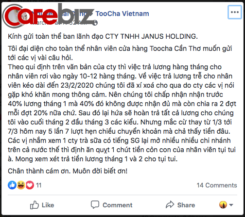 Sau đó lại hứa sẽ hoàn trả tất cả lương cho chúng tôi vào cuối tháng 2 đầu tháng 3 các kiểu. Nhưng mắc cười thay từ 1/3 tới 7/3 hôm nay 5 lần 7 lượt hẹn chiều chuyển khoản mà chả thấy tiền đâu. Các vị nhắm xem 1 công ty trà sữa có tiếng ở Sài Gòn, lại mở nhiều nhiều chi nhánh trên cả nước thế thì định ăn quỵt 1 chút tiền cỏn con của nhân viên tụi tui à. Mong xem xét trả tiền lương tháng 1 và 2 cho tụi tui", status của một nhân viên tag thẳng đến Fanpage của thương hiệu vào ngày 7/3.