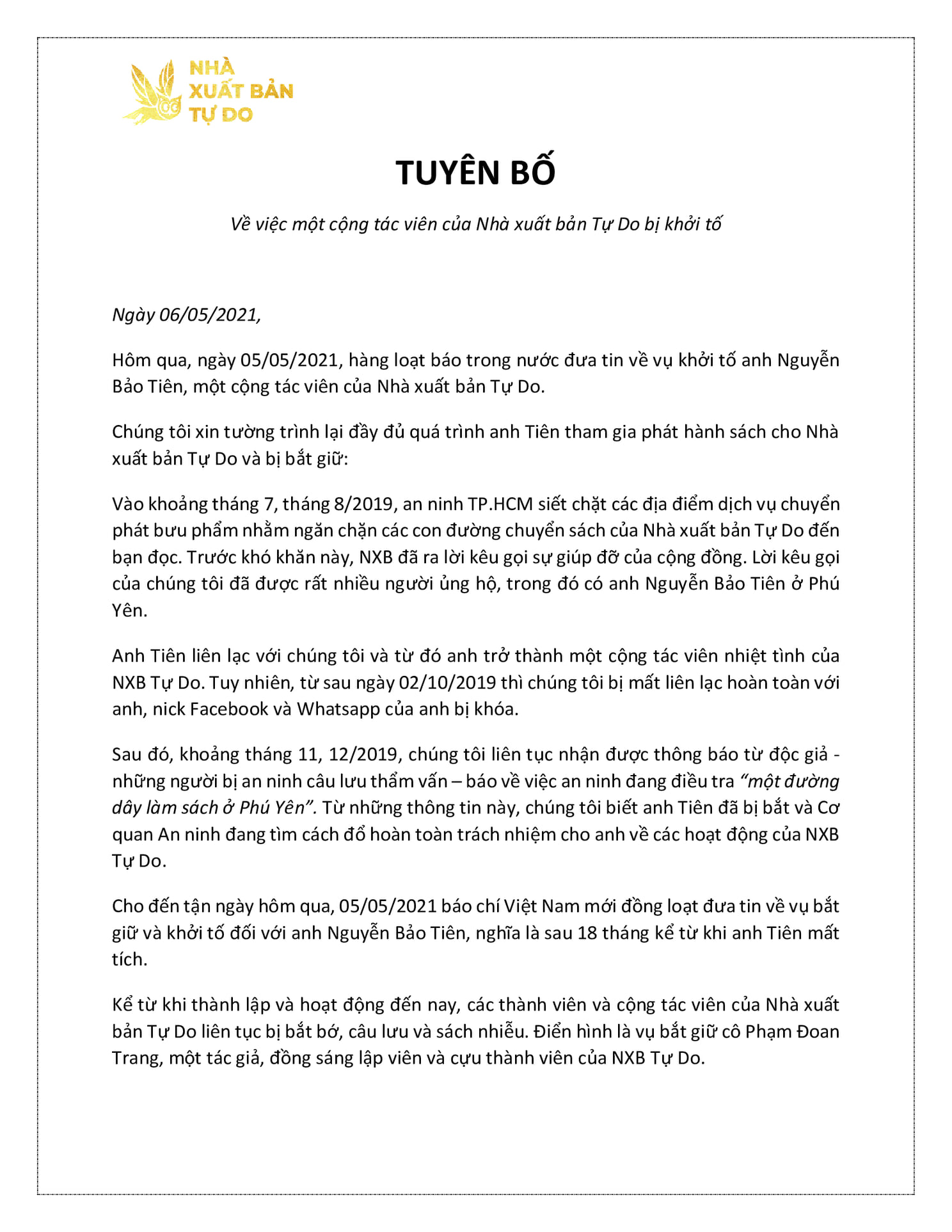 Tuyên bố của NXB Tự do về vụ anh Nguyễn Bảo Tiên bị khởi tố
