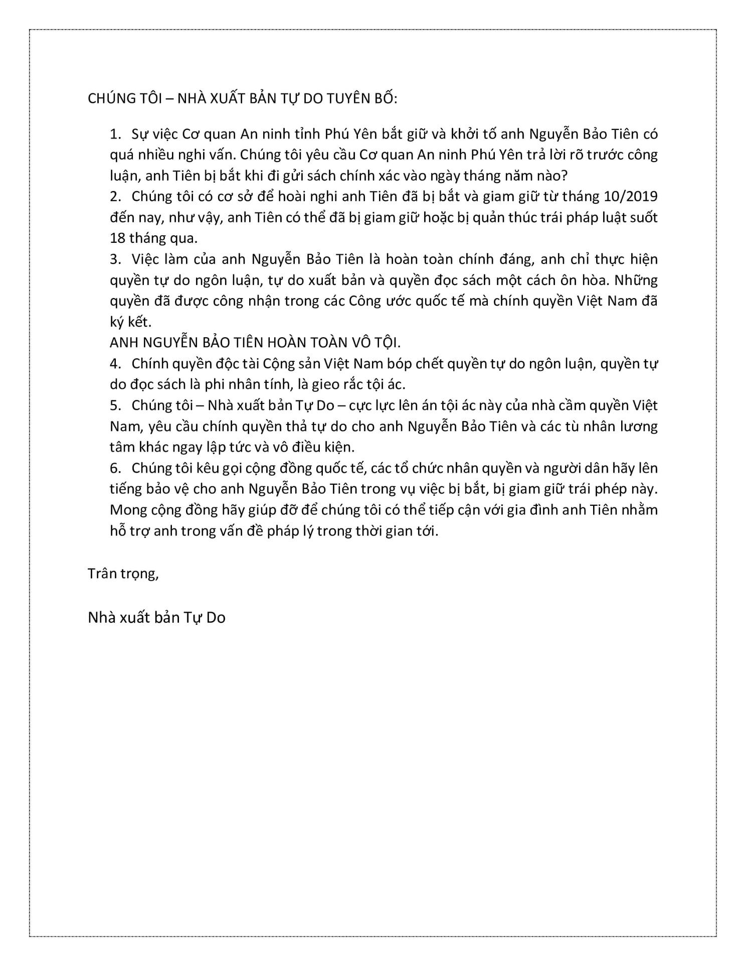 5. Chúng tôi – Nhà xuất bản Tự Do – cực lực lên án tội ác này của nhà cầm quyền Việt Nam, yêu cầu chính quyền thả tự do cho anh Nguyễn Bảo Tiên và các tù nhân lương tâm khác ngay lập tức và vô điều kiện.