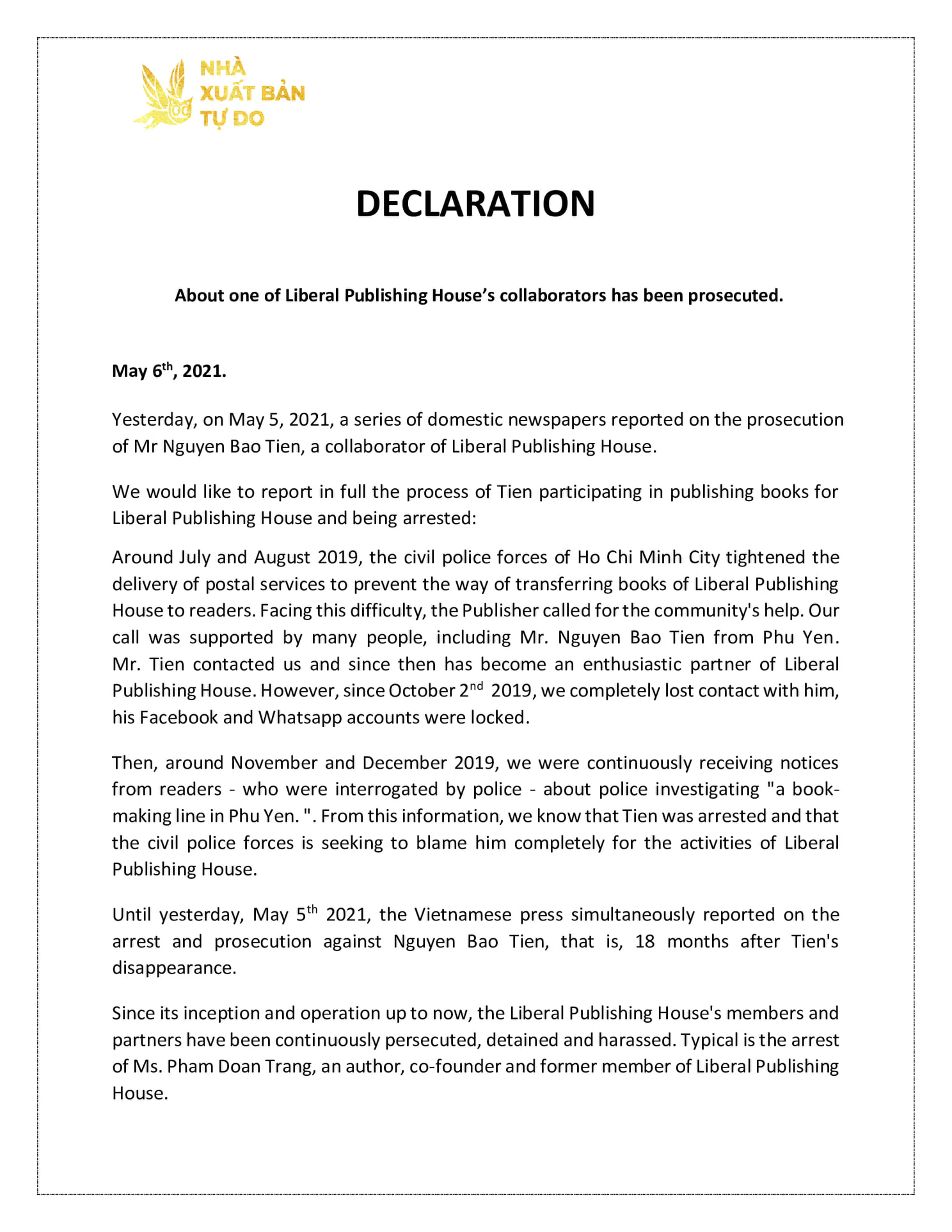 Yesterday, on May 5, 2021, a series of domestic newspapers reported on the prosecution of Mr Nguyen Bao Tien, a collaborator of Liberal Publishing House.