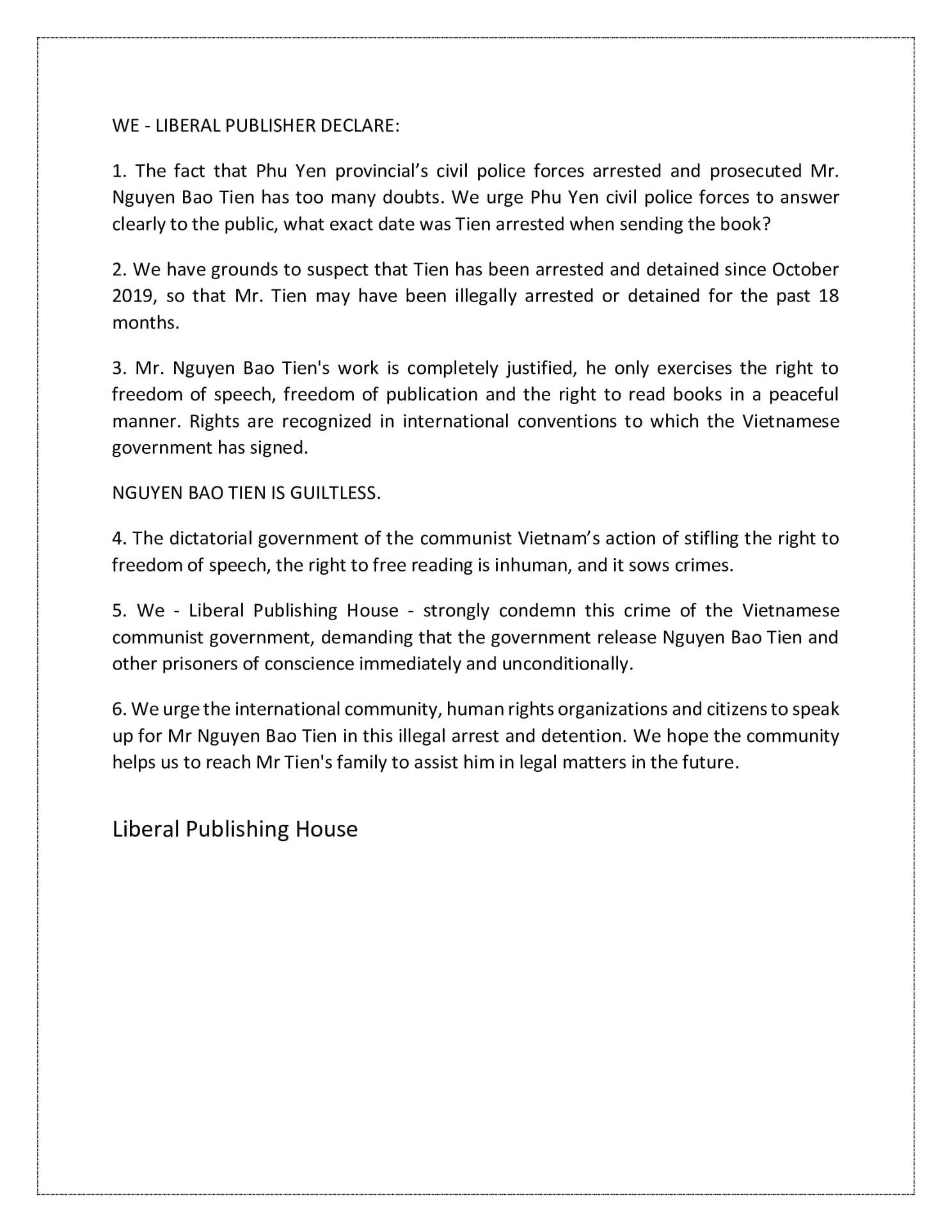 5. We – Liberal Publishing House – strongly condemn this crime of the Vietnamese communist government, demanding that the government release Nguyen Bao Tien and other prisoners of conscience immediately and unconditionally.